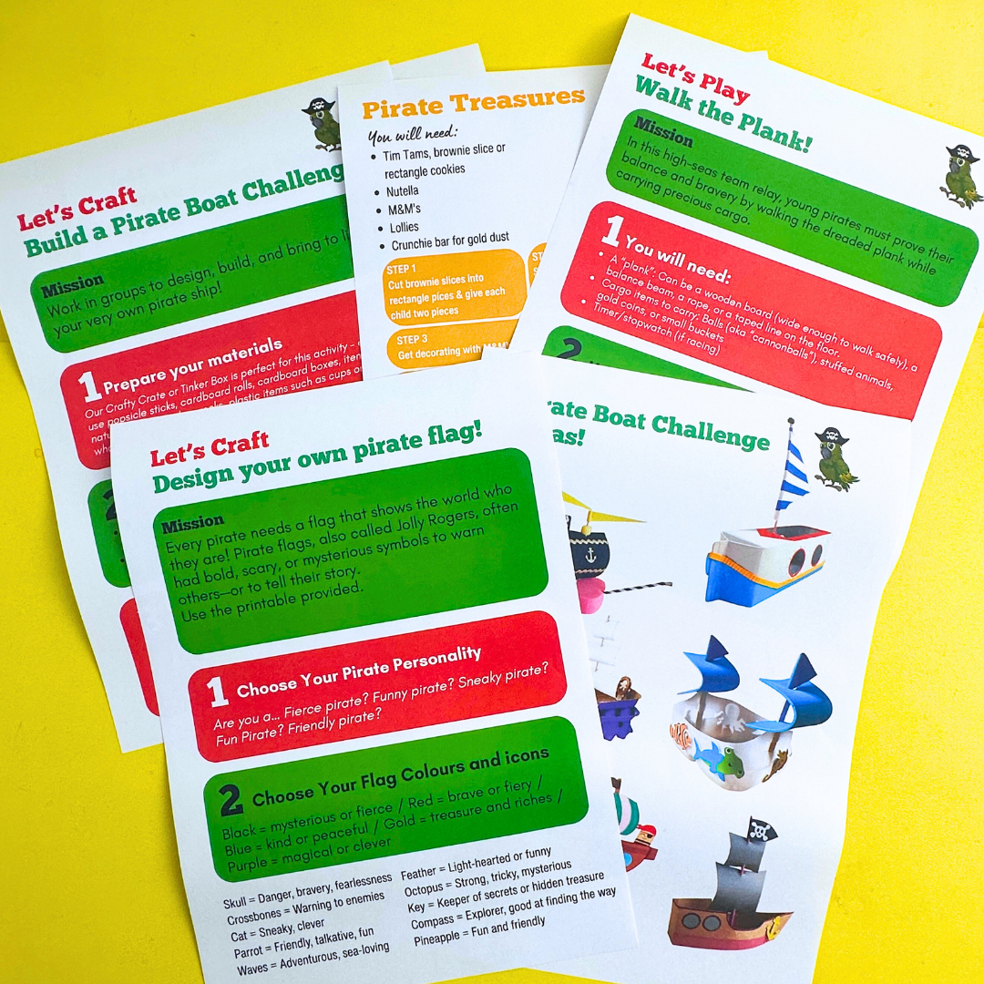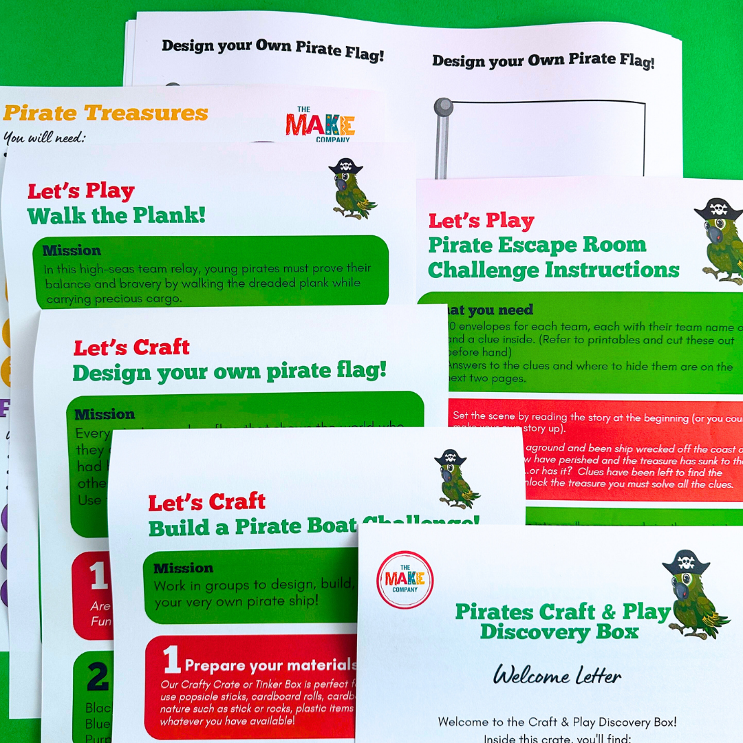 Ahoy, mateys! Set sail on a crafty adventure with our Pirates Craft & Play Discovery Box! Perfect for up to 10 young buccaneers, this box is packed with swashbuckling fun—including pirate-themed crafts, hands-on activity workbooks, games, and printables. From treasure maps to pirate hats, kids will love diving into a world of imagination and adventure.