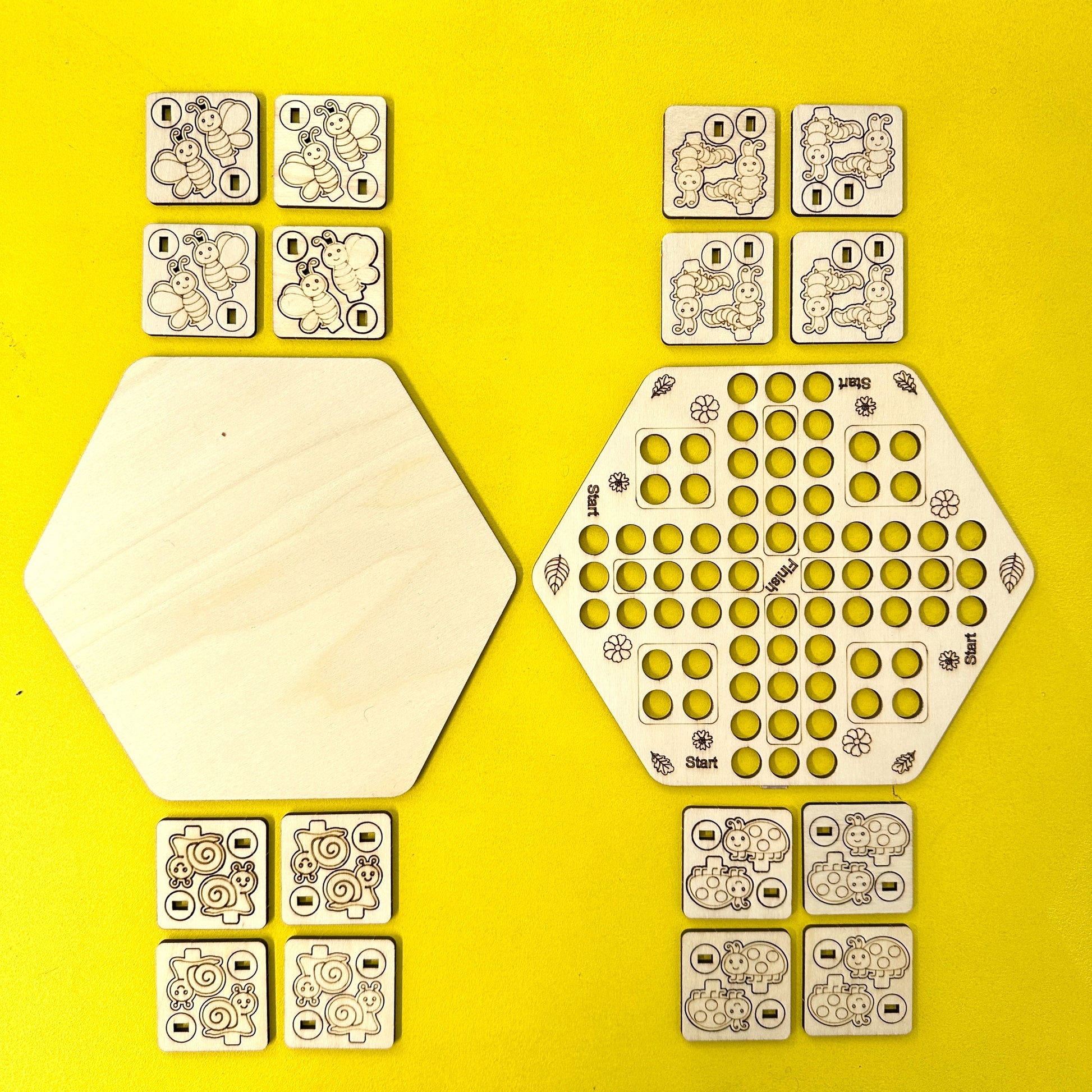 - Pre-printed wooden Ludo board template with holes and playing pieces (featuring bees, ladybugs, snails and worms)